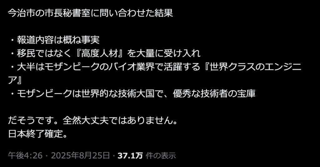 しかし、モザンビークのホームタウンに認定されている今治市にSNSユーザが問い合わせたところ、今治市は『高度人材』の大量受け入れを想定していることがわかり、SNS上で不安が広がっています。