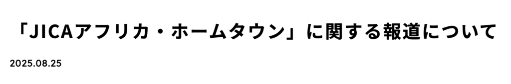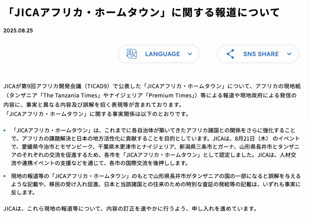 この騒動に対してJICAは公式ホームページにおいて、ホームタウン認定はあくまで国際交流の後押しであり、移民の促進や特別ビザの発給は行わないとする立場を明確にしました。